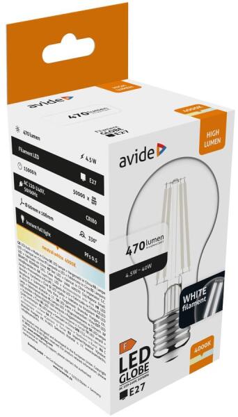 4,5W Avide LED White Filament Globe led, E27-es foglalatú fényforrás. Természetes fehér, 4000K színhőmérsékletű. 470lm fényáramával egy hagyományos 40W-os izzó kiváltására alkalmas. Tiszta üveg burájával és gömb  formájával széleskörűen felhasz nálhatjuk otthonunkban.  Csillárokban, éjjeli lámpákban, álló lámpákban, asztali lámpákban egyaránt alkalmazható. 330°-os szórásszög. Kis fogyasztásával pénzt és energiát takaríthatunk meg. Újdonságot jelent, hogy a sárga LED szálat fehérre cserélték, így kikapcsolt állapotban is dekoratív a fényforrás megjelenése.  Innen az elnevezés, White Filament.
