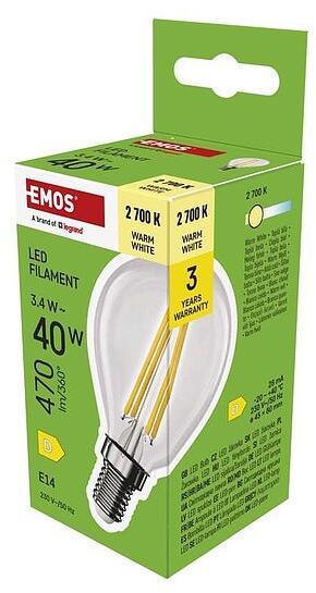 technológia: LED, foglalat: E14, fény színe: meleg fehér, helyettesítő: 40 W, forma: Mini Globe, fényáram: 470 lm, színhőmérséklet: 2 700 K, fogyasztás: 3,4 W, sorozat: FILAMENT, fényhasznosítás: 138 lm/W, energiaosztály: D, sugárzási szög: 360, élettartam: 25 000 óra, garancia-időszak: 3 év, teljesítménytényező: 0.50, kapcsolási ciklusok száma: 25 000, színvisszaadási index (CRI): Ra >80, chipek típusa: COB, chipek száma: 4, feszültség: 230 V~/50 Hz, méretek: 80 × 45 × 45 mm, értékesítési csomagolás: 1 db, kis doboz