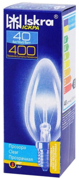 40W E14 ISKRA víztiszta hagyományos háztartási csak 7 ponton rögzített wolframszálas gyertya izzó. Teljesítmény 220/230V - 40W -50/60Hz Fényerő 400 lumen Színhőmérséklet 2700K Kapcsolások száma / Üzemidő kb. 1000x / 1000h Méret C35 - 35 mm x 95 mm Kiszerelés:1/10/100db