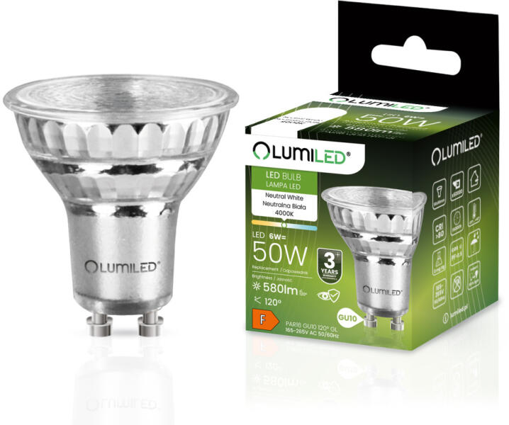 Lumileds GU10 LED izzó 6W = 50W 580lm 4000K semleges 120°-os üveg LUMILED (LUMLEDF3023)