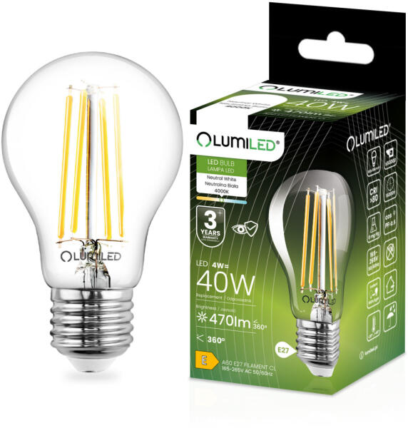 Lumileds LED izzó E27 A60 4W = 40W 470lm 4000K Semleges 360° Izzószálas LUMILED