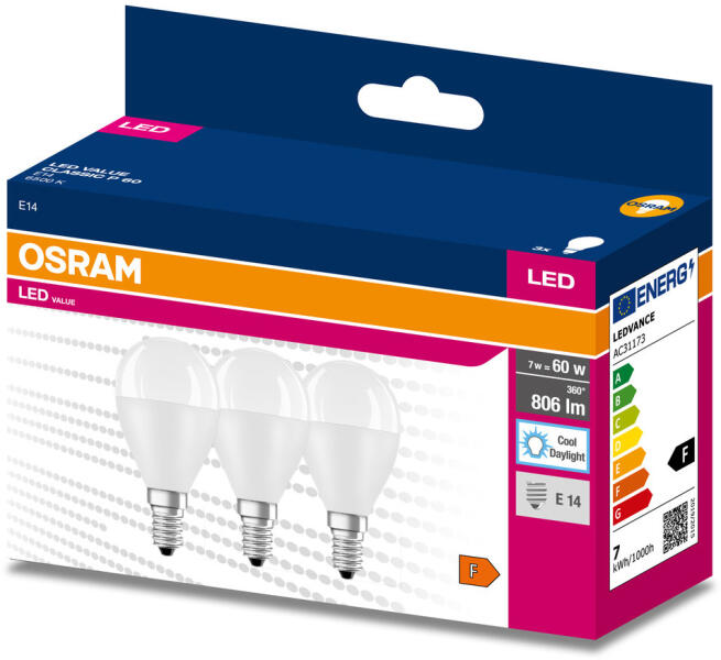 OSRAM 3db LED izzó Gömb E14 P45 7W = 60W 806lm 6500K Hideg 200° OSRAM érték (4058075476325)
