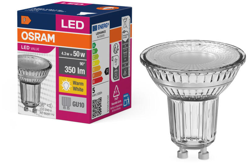 OSRAM LED izzó PAR16 reflektor GU10 4.3W = 50W 350lm 2700K Meleg 36° VALUE Osram (4058075521681)